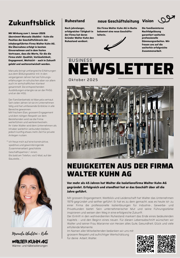 Die Walter Kuhn AG steht für Qualität, Zuverlässigkeit und flexible Lösungen. Ihre Zufriedenheit als Kundschaft ist unser Gradmesser. Um den vielseitigen Bedürfnissen im Bereich der Dämmtechnik gerecht zu werden, kombinieren wir fundierte Erfahrungswerte mit innovativen Ideen. Unser erfahrenes Team zeichnet sich durch die Fähigkeit aus, auf aktuelle Bedingungen, sei es marktbedingt oder umwelttechnisch, flexibel zu reagieren.